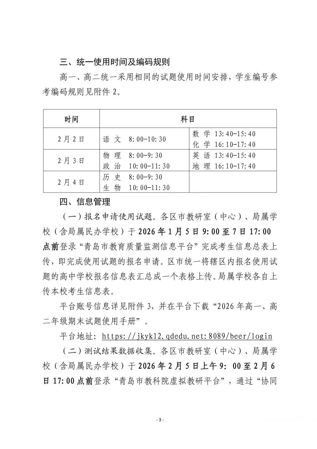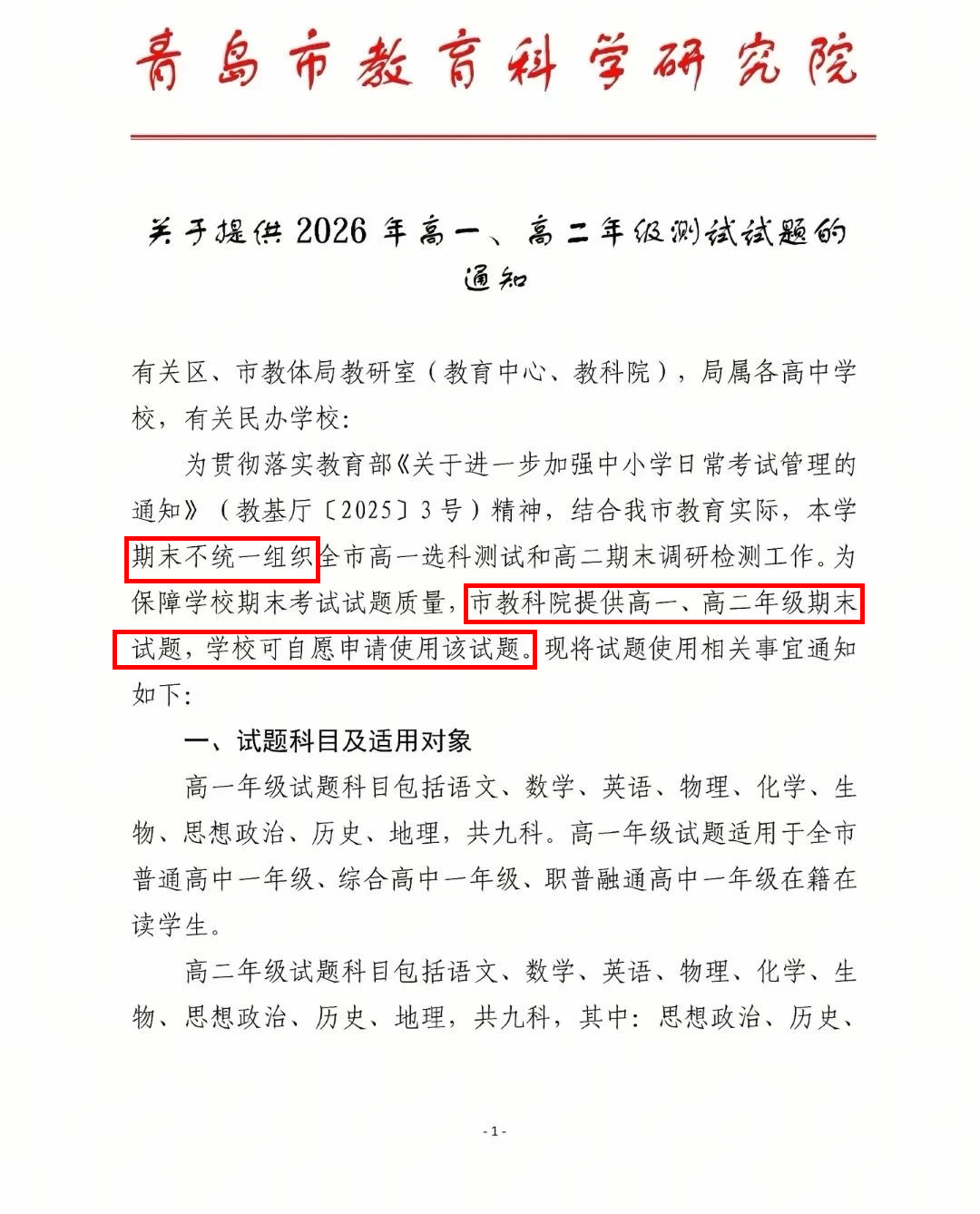 青岛本学期不统一组织全市高一选科测试和高二期末调研监测,市教科院提供高一、高二期末试题,学校自愿申请使用。