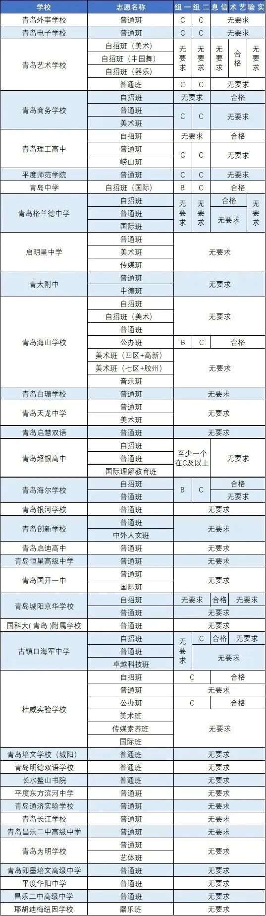 青岛各高中的要求基本遵循以下规律:公办普高第二组合必须达到C等及以上;报考优质普高非国际班第*组合基本都要在B等及以上;公办普高国际班、三类高中和综合高中第*组合要求基本是C;民办普高大多不做组合要求。