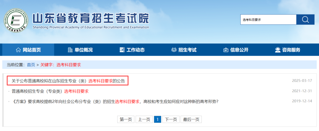 这里以山东警察学院为例,带大家了解一下选科要求。首先,打开山东省教育招生考试院官网,在搜索栏搜索关键字:“选考科目要求”,点击查询,如下图: