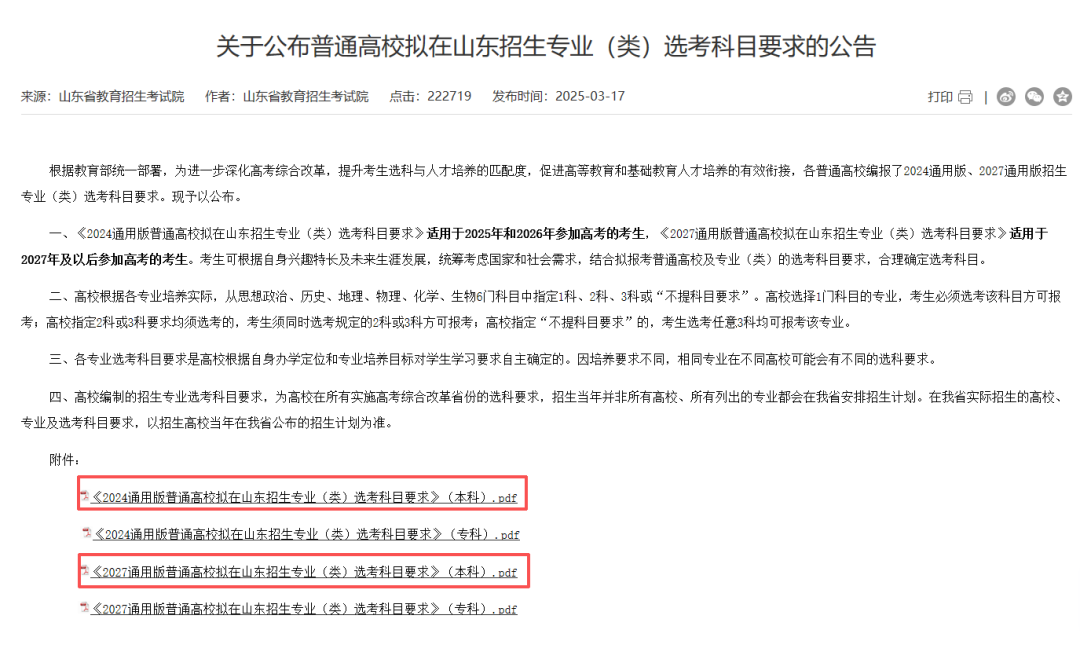 但是需要注意,《2024通用版普通高校拟在山东招生专业(类)选考科目要求》适用于2025年和2026年参加高考的考生,《2027通用版普通高校拟在山东招生专业(类)选考科目要求》适用于2027年及以后参加高考的考生