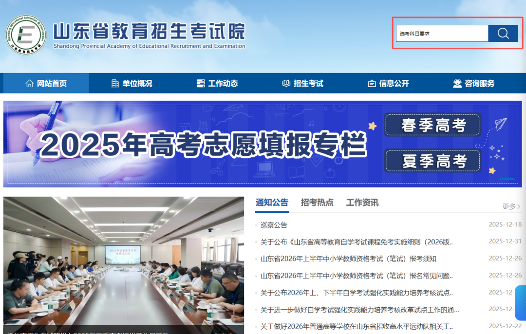在这里,我们以国防科技大学为例带大家了解一下选科要求。首先,打开山东省教育招生考试院官网,在搜索栏搜索关键字:“选考科目要求”,点击查询,如下图: