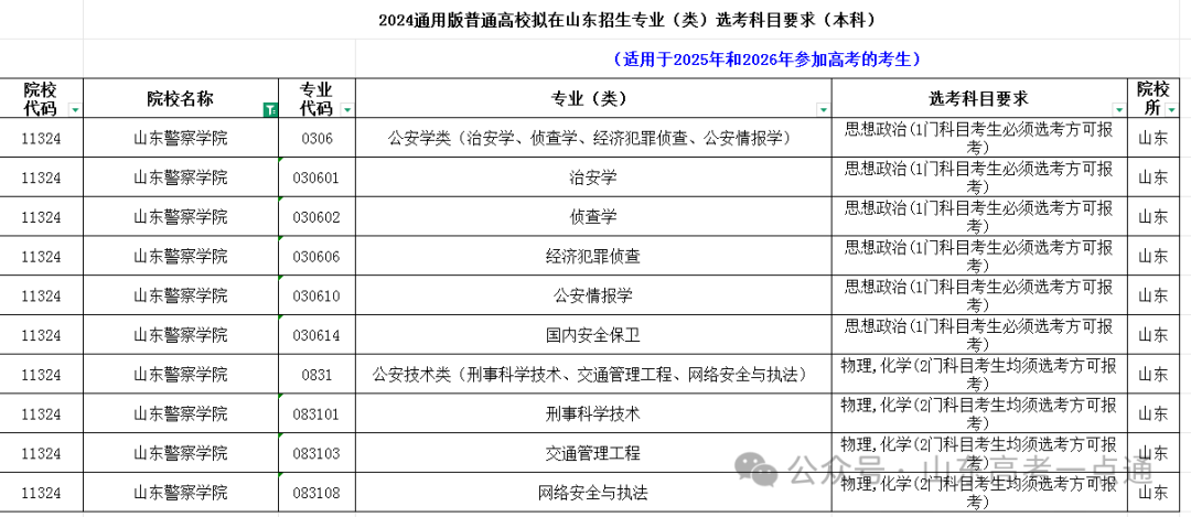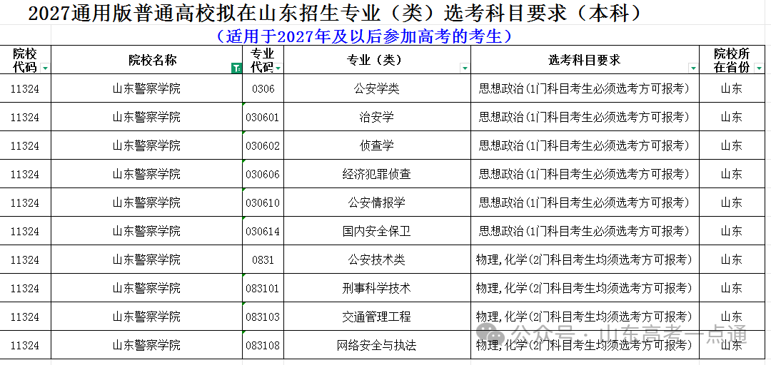 将文件下载下来后,筛选出山东警察学院的《2024通用版普通高校拟在山东招生专业(类)选考科目要求》和《2027通用版普通高校拟在山东招生专业(类)选考科目要求》即可。检索如下: