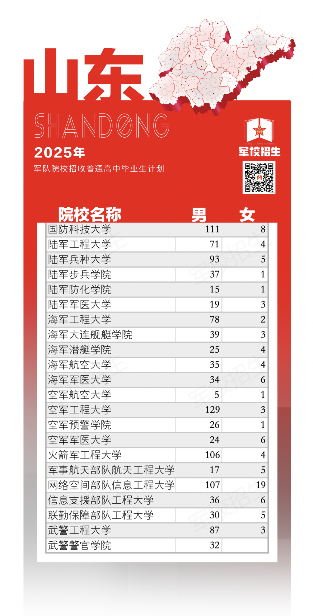2025年军队院校在山东招生计划