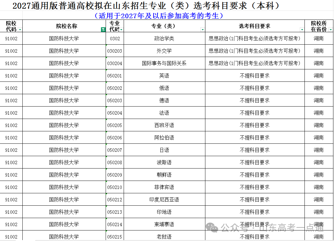 将文件下载下来后,筛选出国防科技大学的《2024通用版普通高校拟在山东招生专业(类)选考科目要求》和《2027通用版普通高校拟在山东招生专业(类)选考科目要求》即可。检索如下: