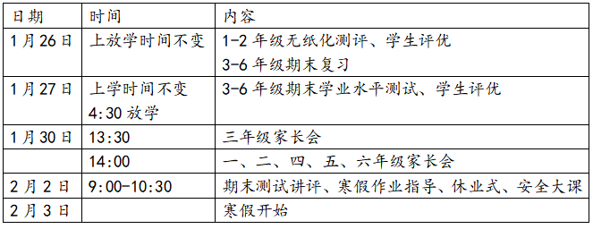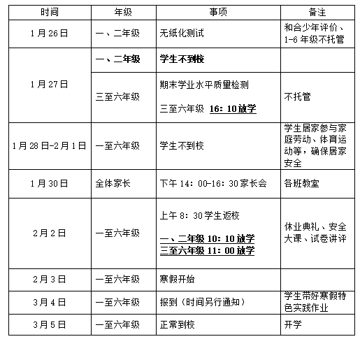 1月31日(周六)上午返校放假(调休2月2日),上午正常时间放学,下午不到校,假期开始。