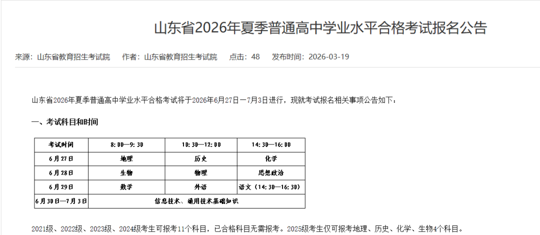 山东省2026年夏季普通高中学业水平合格考试将于2026年6月27日—7月3日进行,现就考试报名相关事项公告如下: