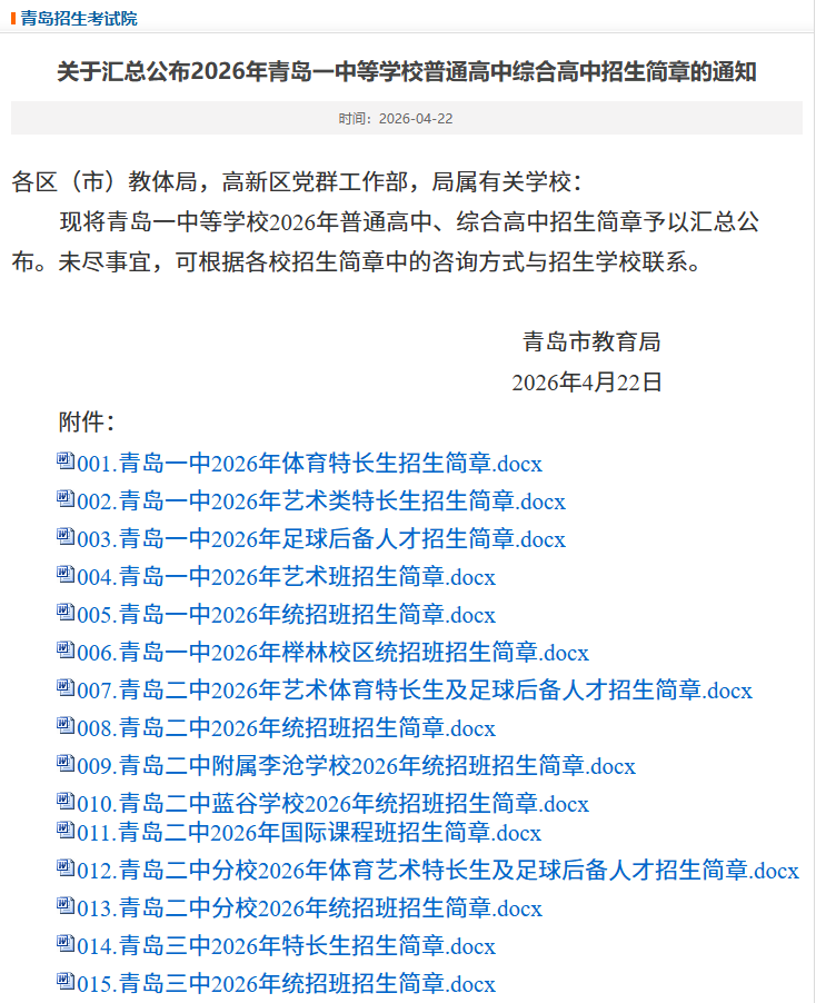 青岛一中等学校2026年普通高中、综合高中招生简章已公布。未尽事宜,可根据各校招生简章中的咨询方式与招生学校联系。